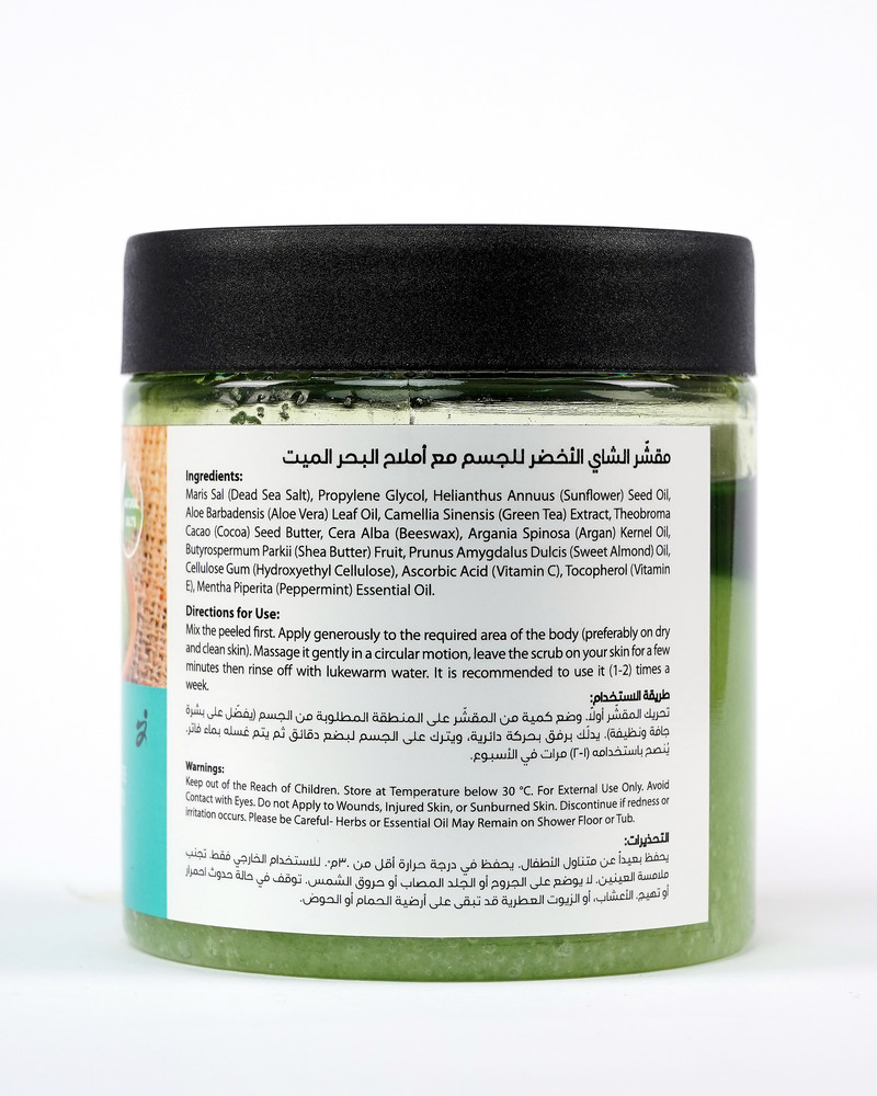 Our all-natural Green Tea Body Scrub blends Dead Sea minerals with the healing properties of Green Tea extract and rich essential oils such as Peppermint Oil, Argan Oil, and Sunflower Oil to enhance and replenish your skin, leaving it healthy and smooth.
