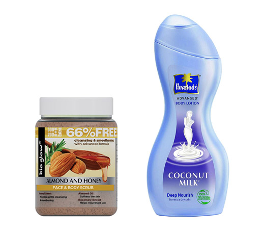 Cleanse and nourish your skin with this combo pack of Bio Glow Almond and Honey Face and Body Scrub and Parachute Advansed Deep Nourish Body Lotion. The Bio Glow scrub comes with the goodness of honey and almond oil, which gently cleanses and softens the skin. Post the cleansing session, nourish your skin with 100% natural coconut milk, using the Parachute body lotion, for that naturally glowing skin.