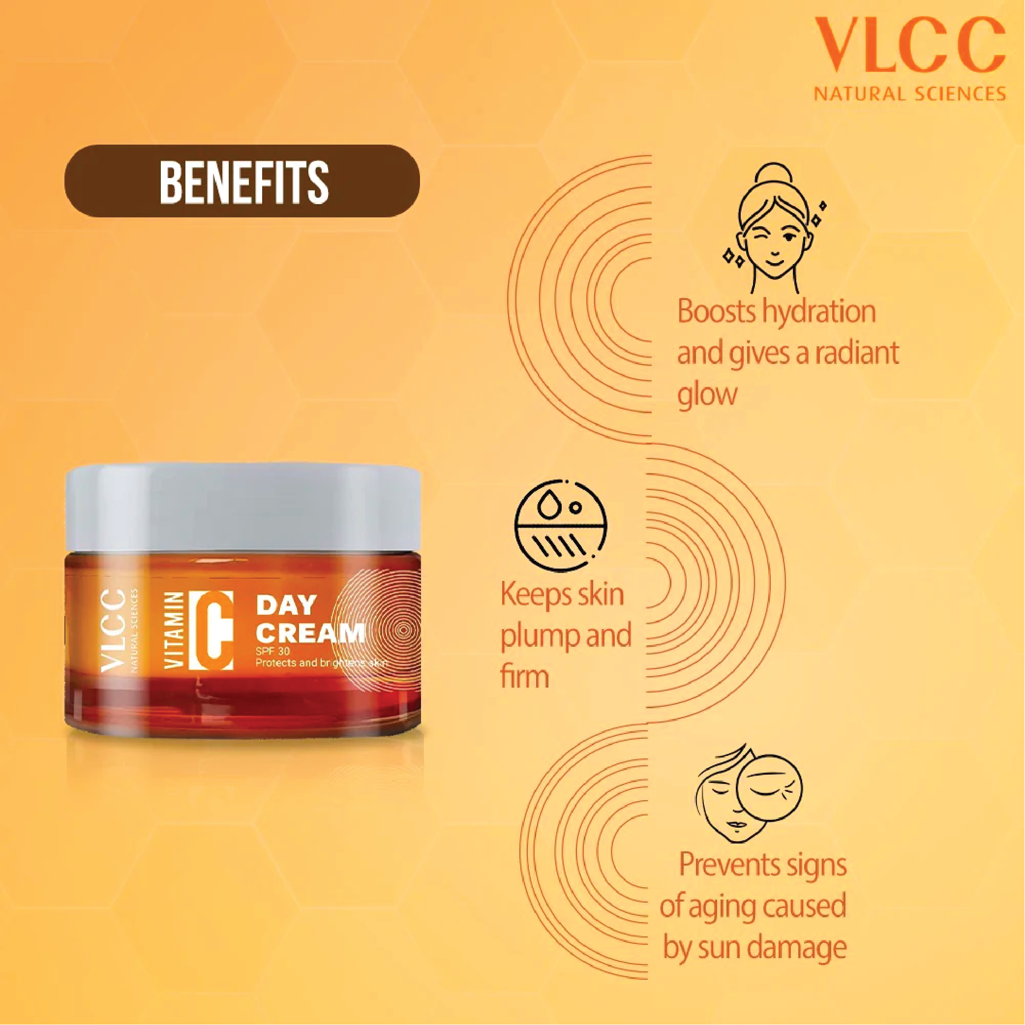 VLCC Vitamin C Day Cream with SPF 30 is lightweight, provides hydration and gives your face a natural glow. Infused with Vitamin C – a powerful antioxidant, free radical neutralizer & collagen booster while Green tea extract & SPF 30 fight photoaging, repair skin cell and help to diminish the signs of skin aging.